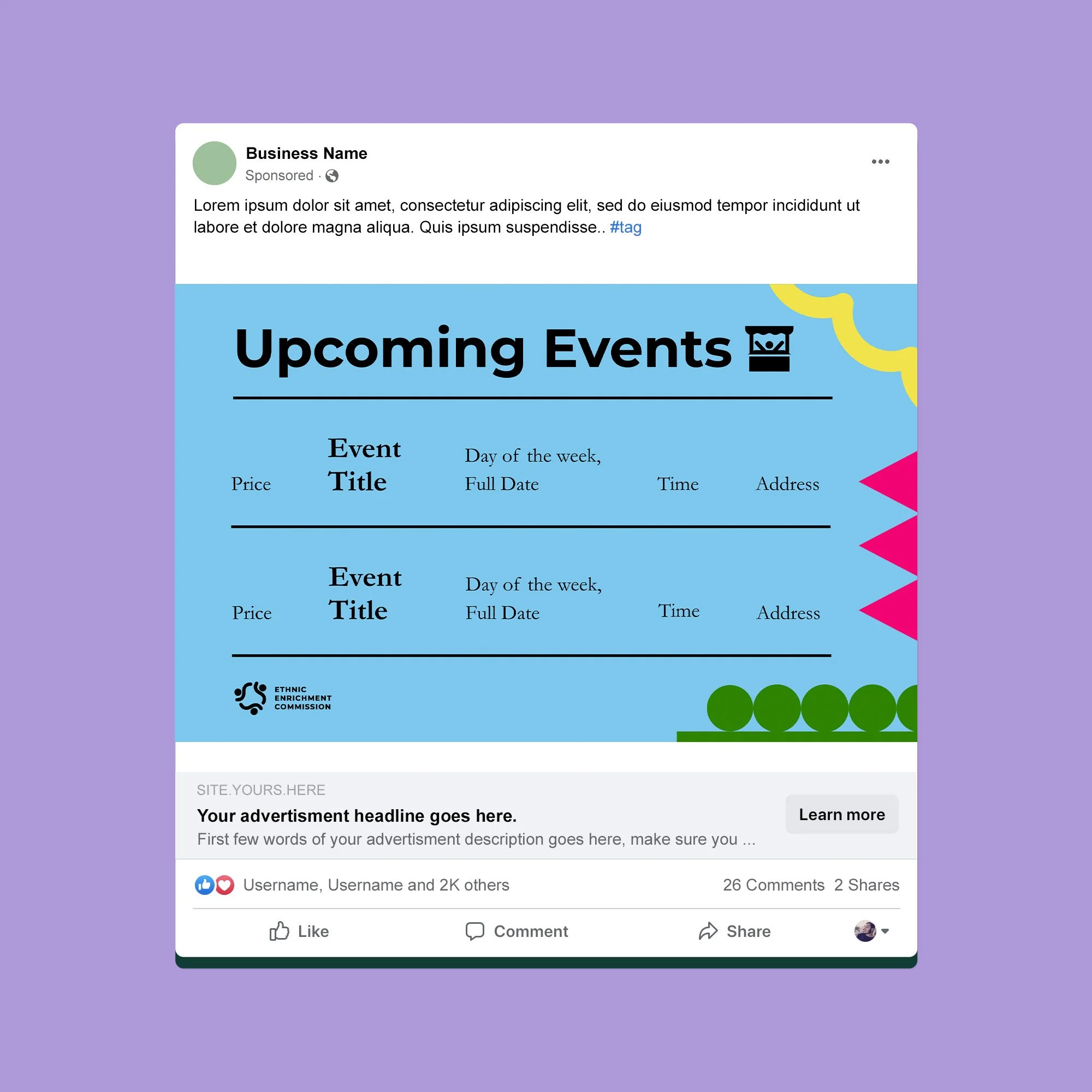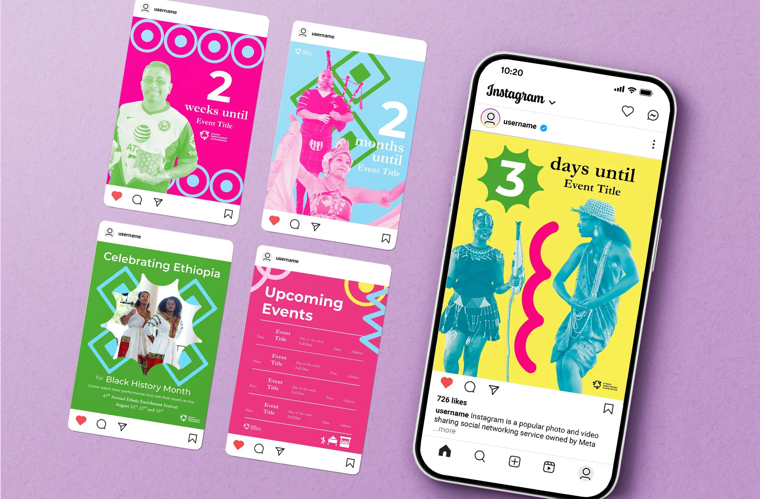 I was in charge of creating some initial social media posts for our pitch, so I used a flowing frame shape combined with our icons at the bottom of each post. After the pitch, we split into new teams, and I returned to the social media group, where we refined how our posts would look within our concept. I created spotlight posts using photos from the EEC’s festival, where we celebrate the countries they represent during holidays like Black History Month.