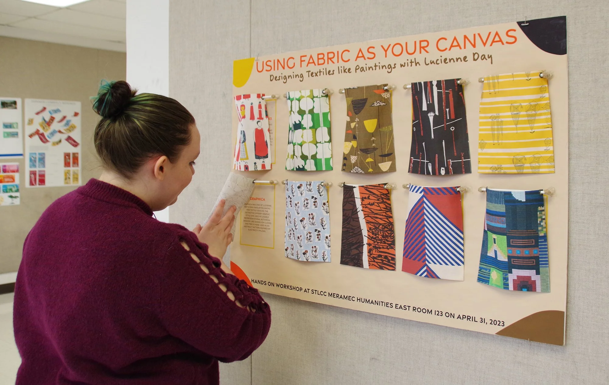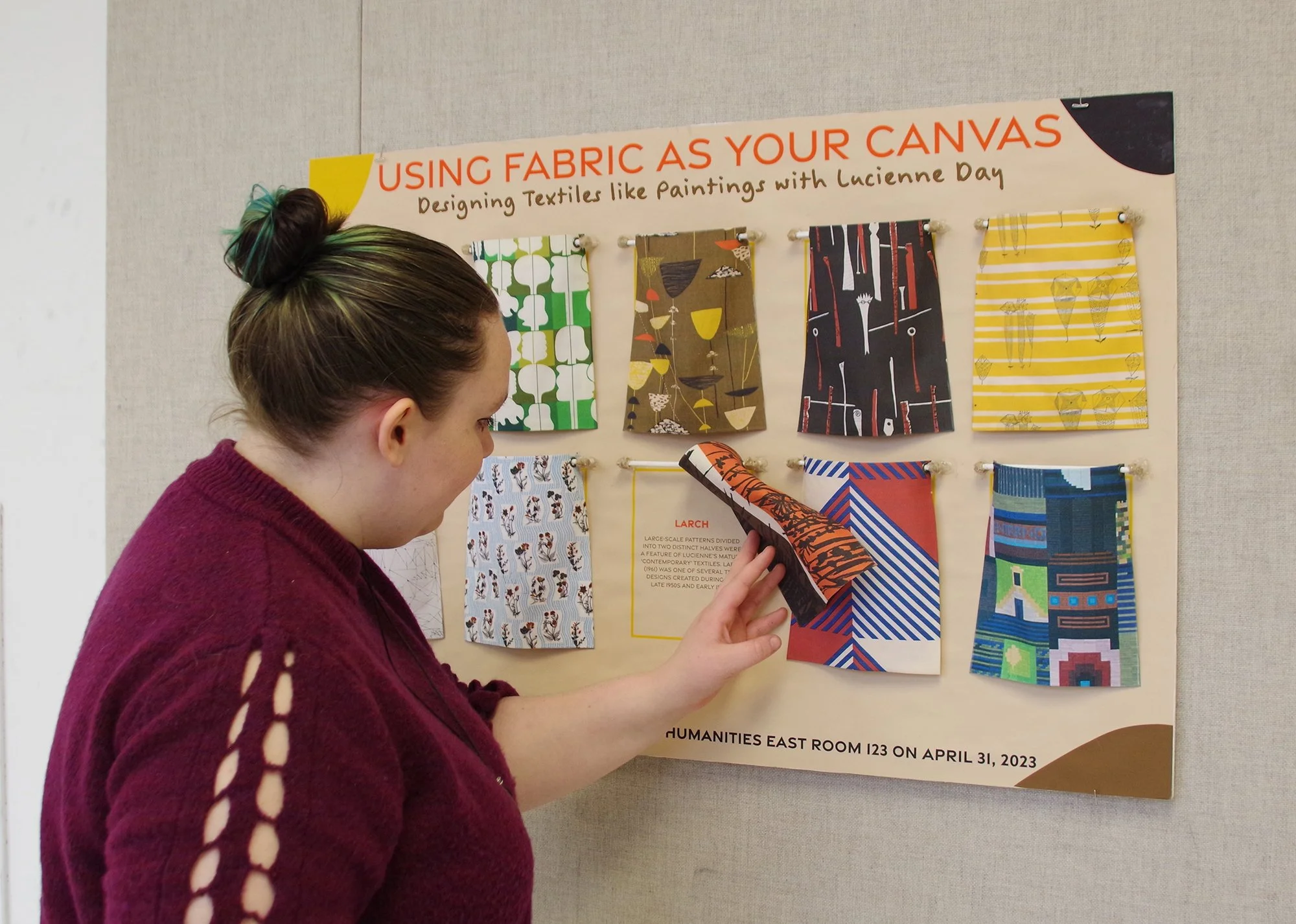 The biggest challenge in designing the poster was finding a way to showcase her fabric effectively. I drew inspiration from the quilt hangers my grandma uses, which allowed the design to lay flat in a curtain-like display. I incorporated multiple fabric patterns from different stages of her career to illustrate her growth as a designer and instead of leaving the space behind the “curtains” empty, I used it to provide information about the design, adding depth and context to the composition.