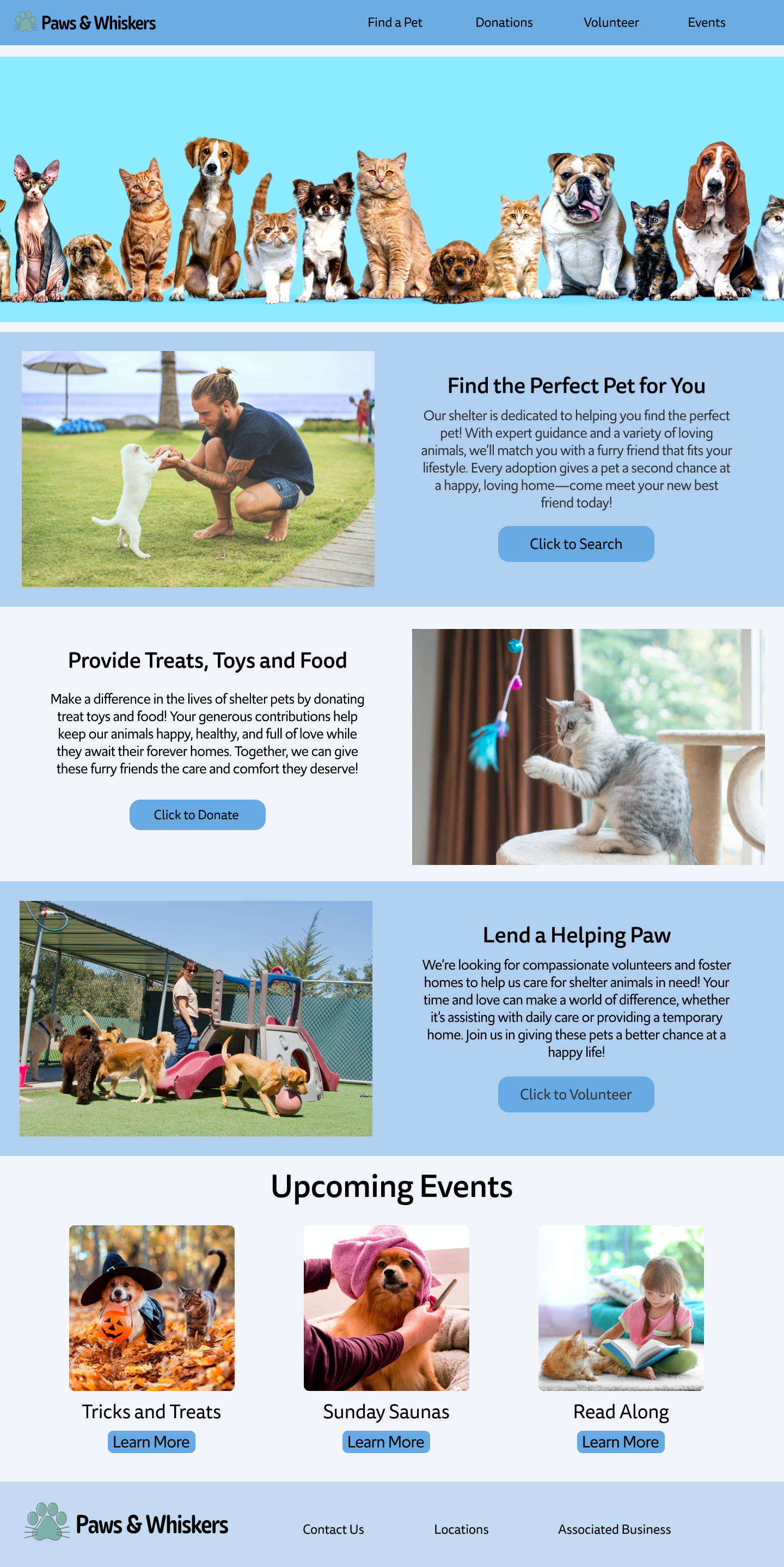 I chose to design a website for a fictional pet adoption and shelter organization called Paws and Whisker, focusing on encouraging pet adoption while providing ways for users to donate and get involved. The website was designed using Figma and includes a fully interactive prototype, complete with hover effects, switches, and functional navigation, simulating a real website experience.