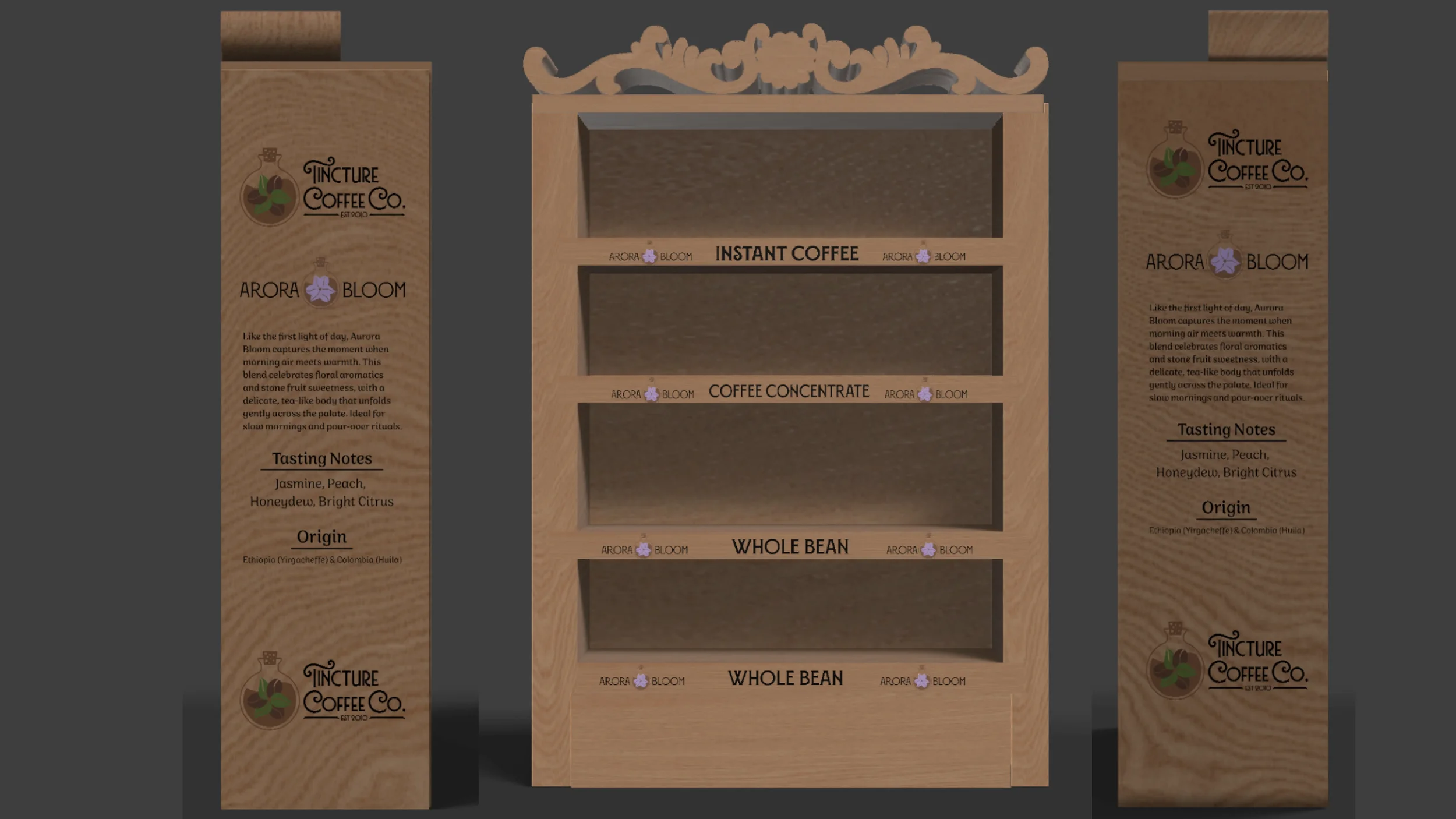 For this project, we were tasked with creating a brand and package design using non-petroleum-based materials. I chose to design coffee packaging and developed a system centered around reusable glass containers that customers could return, supporting a low-waste approach by reducing single-use packaging. I created the brand identity for Tincture Coffee Co., including the logo and product labels for whole bean coffee, coffee concentrate, and instant coffee. I also produced custom packaging mockups and designed an instructional card explaining the return process. In addition, I created a 3D Point-of-Purchase display in Adobe Dimension. All product photos were taken by me.