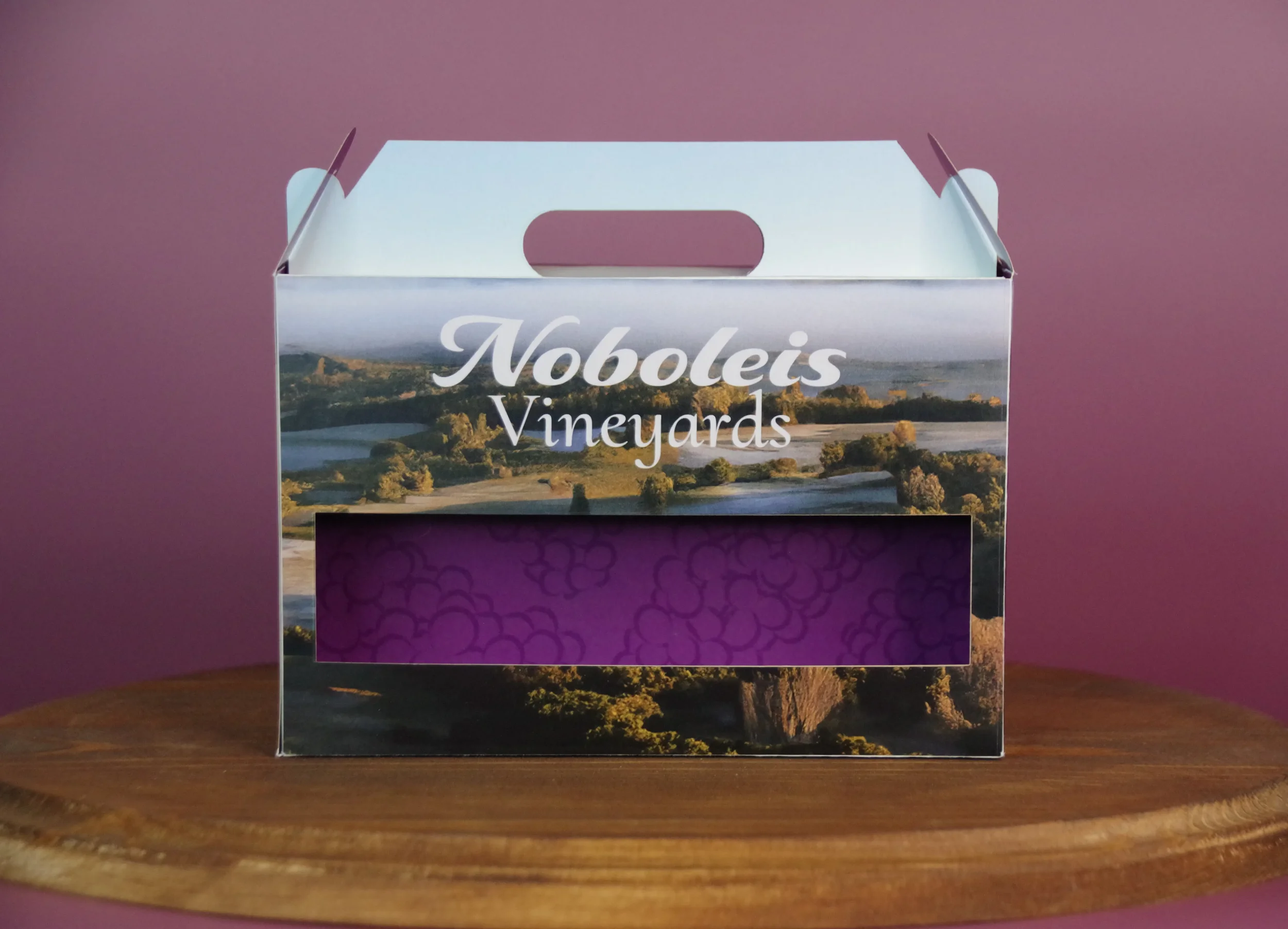 To streamline branding and focus on presentation, I based my design on an existing winery, allowing for a more cohesive brand identity and access to additional resources. The exterior of the box features a photograph of the vineyard, reinforcing the idea that it would be sold as a gift at the winery. Inside, I incorporated a simple grape pattern, adding a thoughtful detail revealed as the bottles are removed.